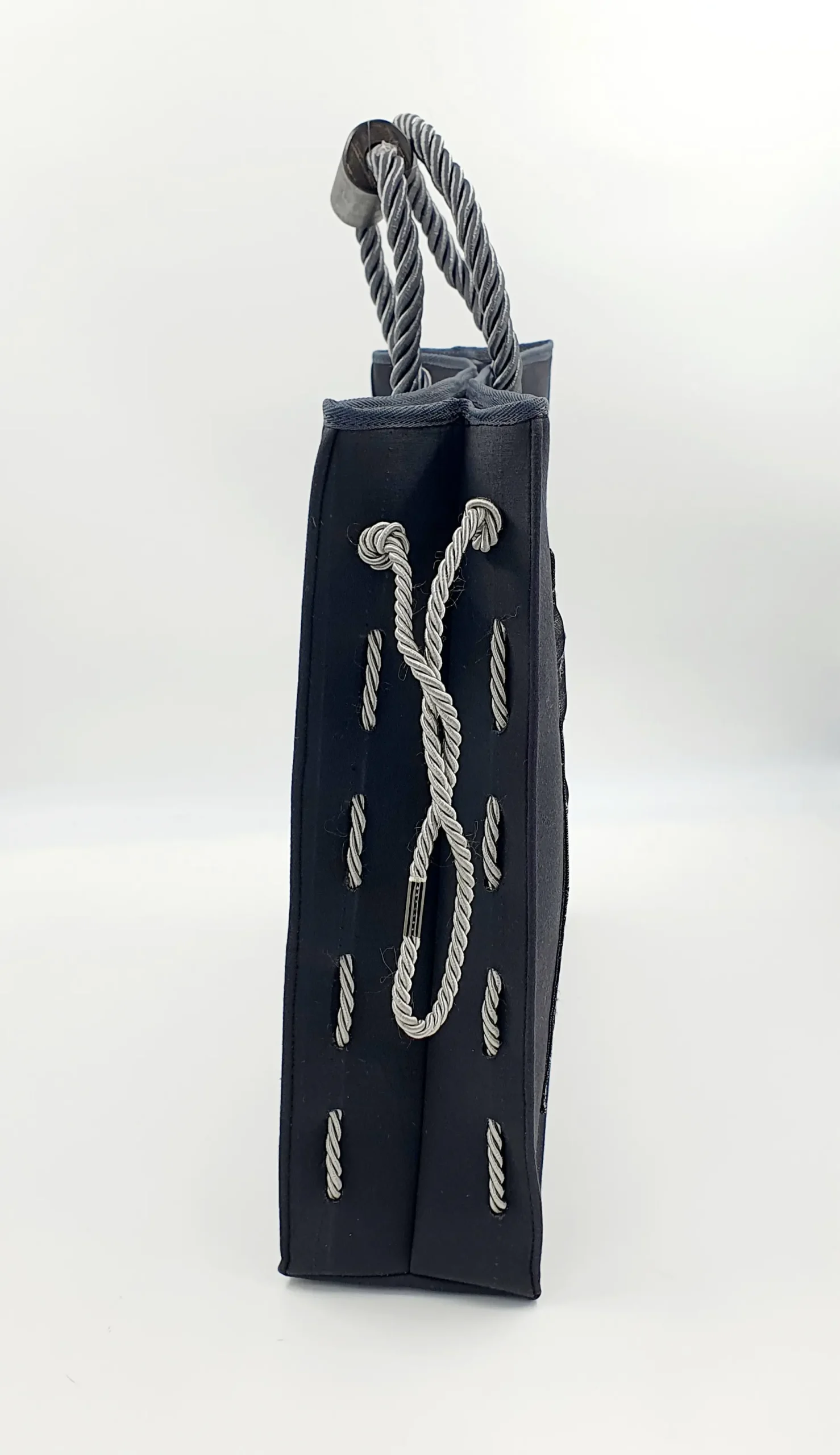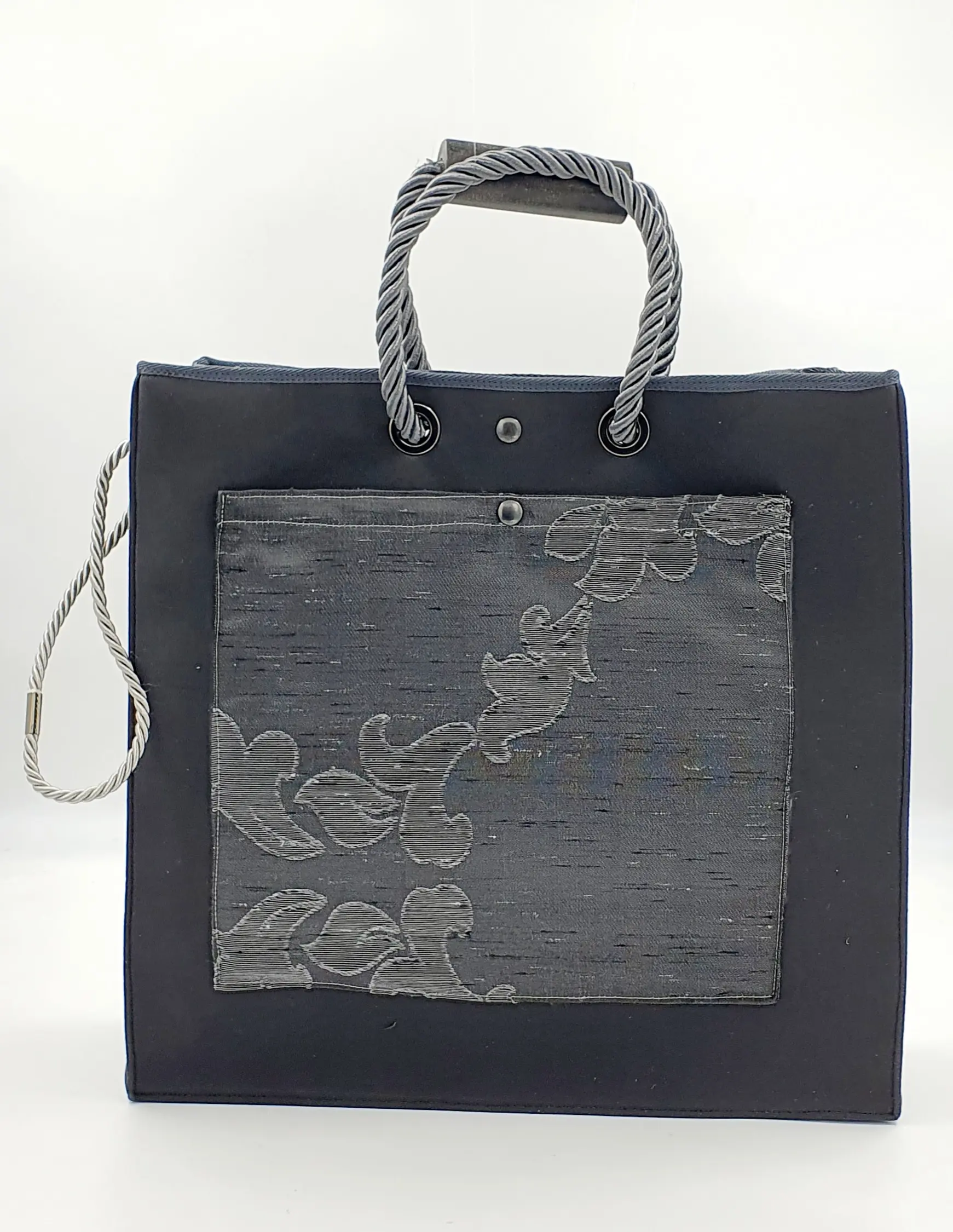Χειροποίητη υφασμάτινη τσάντα γκρι – ανθρακί ώμου. Black nickel λεπτομέρειες .Εσωτερικά υφασμάτινη φόδρα με ενσωματωμένη τσέπη. . Λουρί από ανθρακί κορδόνι με ξύλινη χειρολαβή. Κλείσιμο με κλιπς.